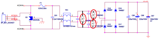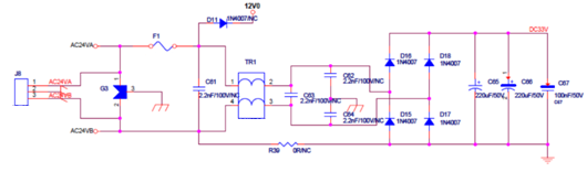 2: 針對此AC24V電源方案,由于其采用了DC-DC芯片轉換,所以整流橋負極性的地與后極數字地是必須相連的,這與FlyBack電路不同,所以其防護設計需要特別考慮從數字地通過整流橋到接口的路徑。